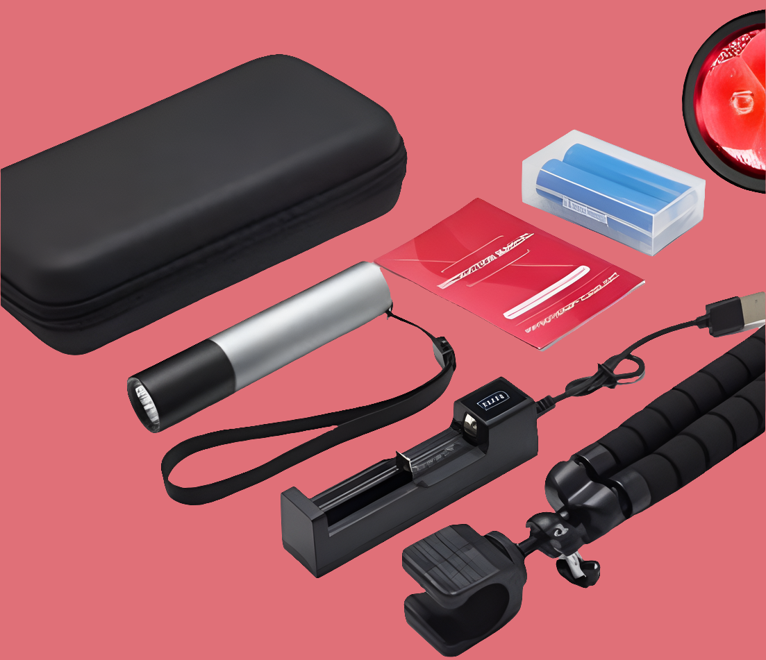 Packing list: Infrared flashlight x1pc /3-core red light flashlight * 1+18650 lithium battery X2+zipper box+triangular bracket+anti loss tail rope+red light instruction manual+USB charger